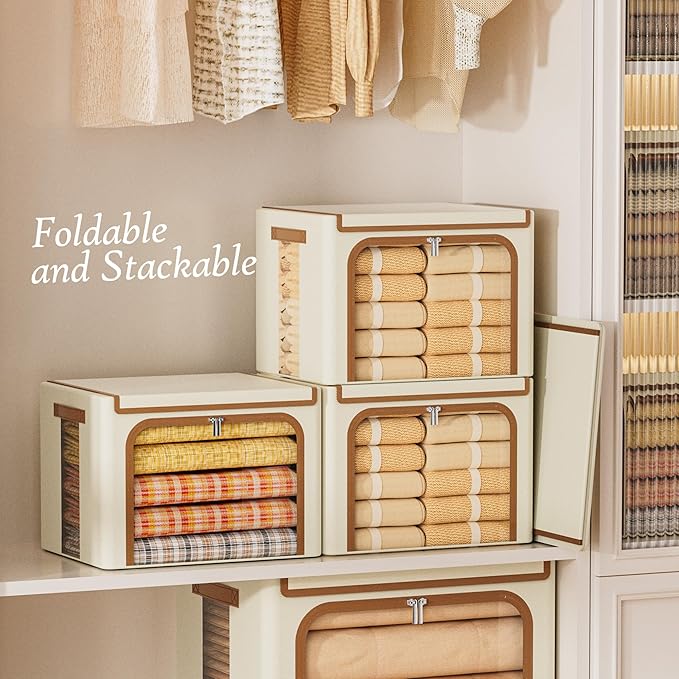 Yecaye Clothes Storage Bins with Metal Frame, Foldable Clothing Storage Bin with Lid, Stackable Oxford Fabric Organizer Box With Clear Window & Zippers & PU Leather Handles (3 Pack,Beige,66L)