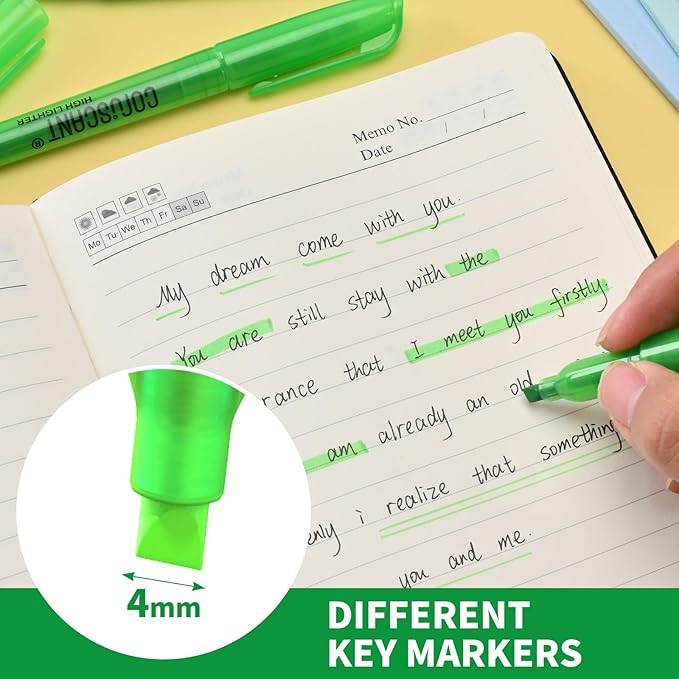 - CHISEL TIP DESIGN: The green highlighter features a versatile chisel tip that allows for both broad and fine lines, making it perfect for underlining text or highlighting important information