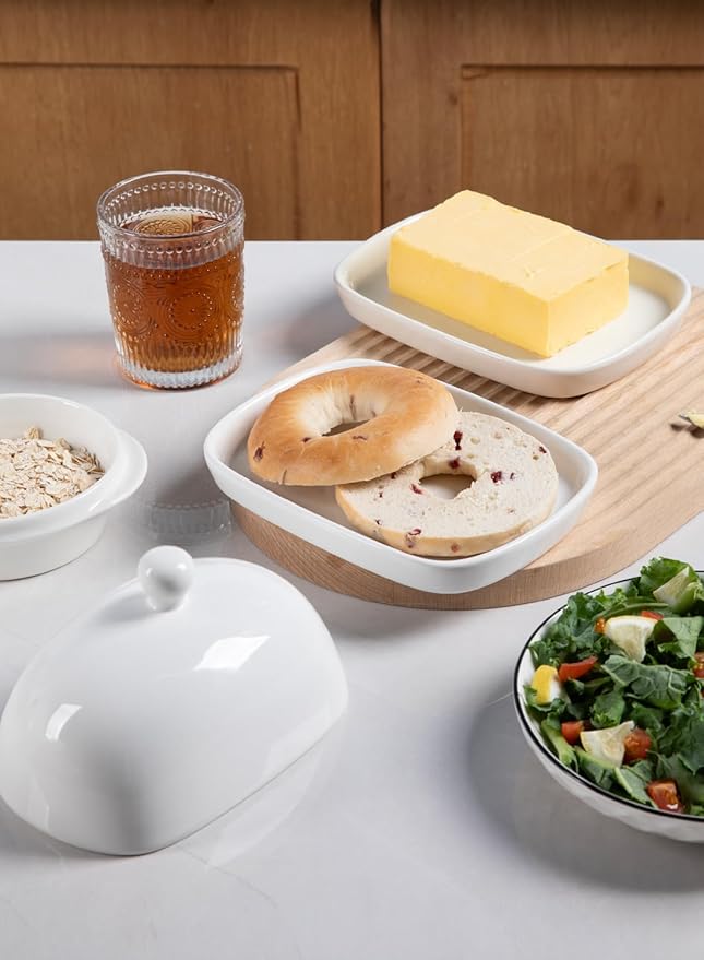 - [Large Capacity and Easy to Clean]This Butter tray size "7.3*5.3*4.1", suitable for the complete "American size" butter stick,including east/west coast butter,this butter dish with lid is perfect for use in kitchens,freezer,counters,restaurants.The smooth glaze is non-stick and makes hand washing easy.Our butter dish with lid for countertop are safe for dishwasher,microwave.You can soften butter in the microwave or oven and instead of trying to scrub inside those oily corners
