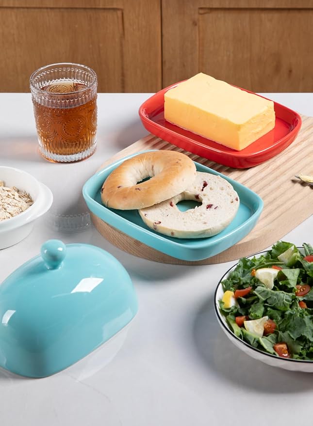- [Large Capacity and Easy to Clean]This Butter tray size "7.3*5.3*4.1", suitable for the complete "American size" butter stick,including east/west coast butter,this butter dish with lid is perfect for use in kitchens,freezer,counters,restaurants.The smooth glaze is non-stick and makes hand washing easy.Our butter dish with lid for countertop are safe for dishwasher,microwave.You can soften butter in the microwave or oven and instead of trying to scrub inside those oily corners
