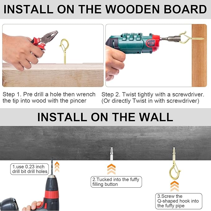 - Easy To Install - Come with plastic tubes, swivel hooks for hanging are easy to install all solid surface such as walls, ceiling, wooden beams, tree, fence, eaves etc. You can pre drill a hole then wrench the string light hooks outdoor directly in.