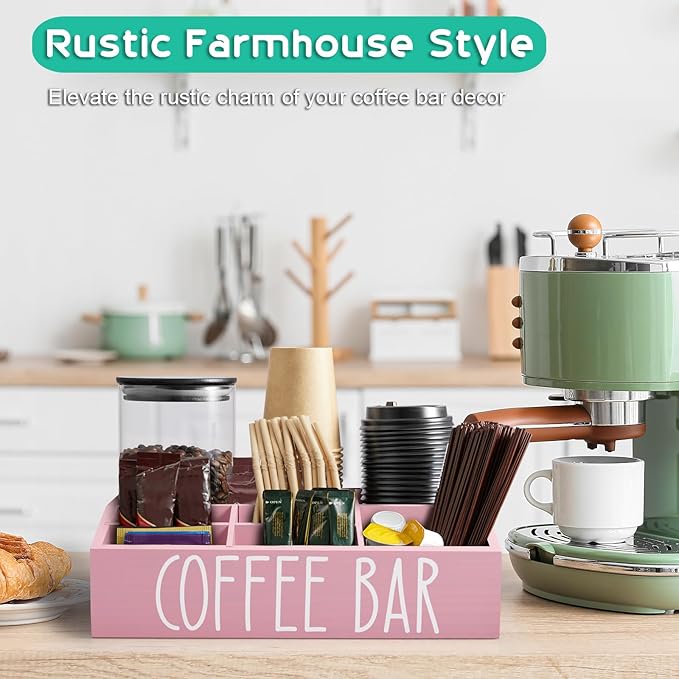 - Coffee Bar Decor - The pink coffee pod organizer is an eye-catching display that brings attractive charm to your buffet, coffee or tea service, or self-serve beverage station. This coffee station basket will make your coffee bar look great!