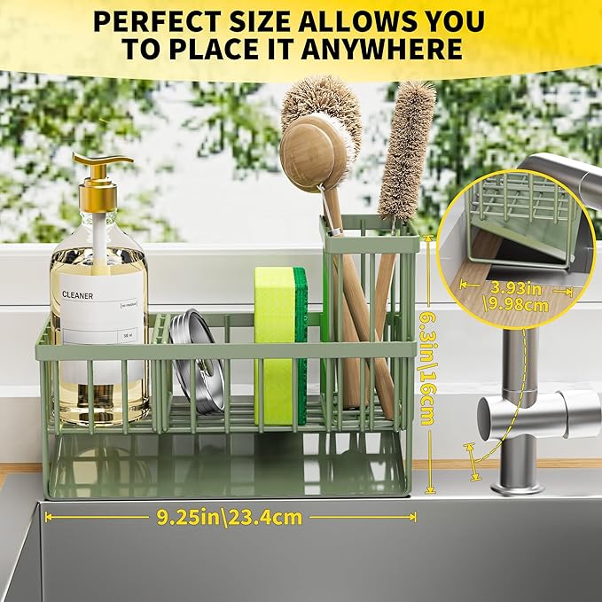 Cisily Kitchen Sink Caddy - Sponge Holder and Organizer with High Brush Holder, 304 Stainless Steel, Sage Green