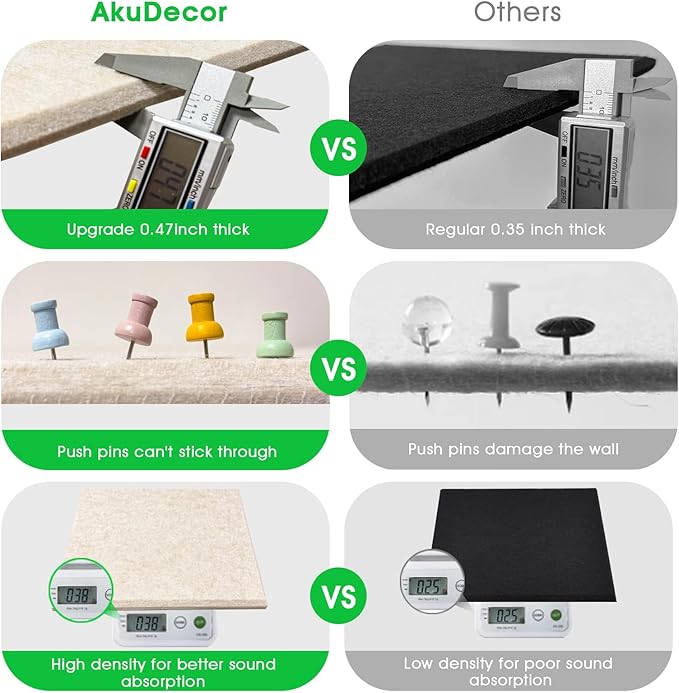 - 【Thickened Cork Boards】Our cork board alternatives have higher thickness (25% thicker) and density (35% denser) than traditional cork boards, which means better durability and sound absorption. It prevents push pins from sticking through the felt board and damaging the wall.