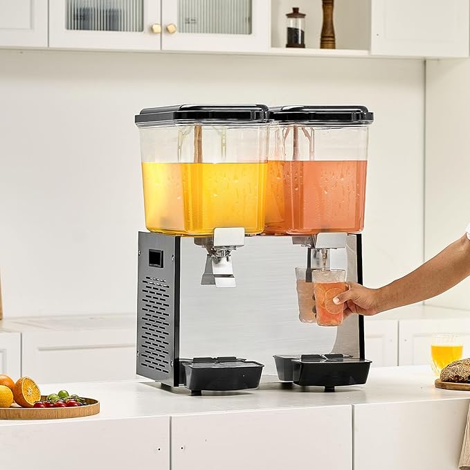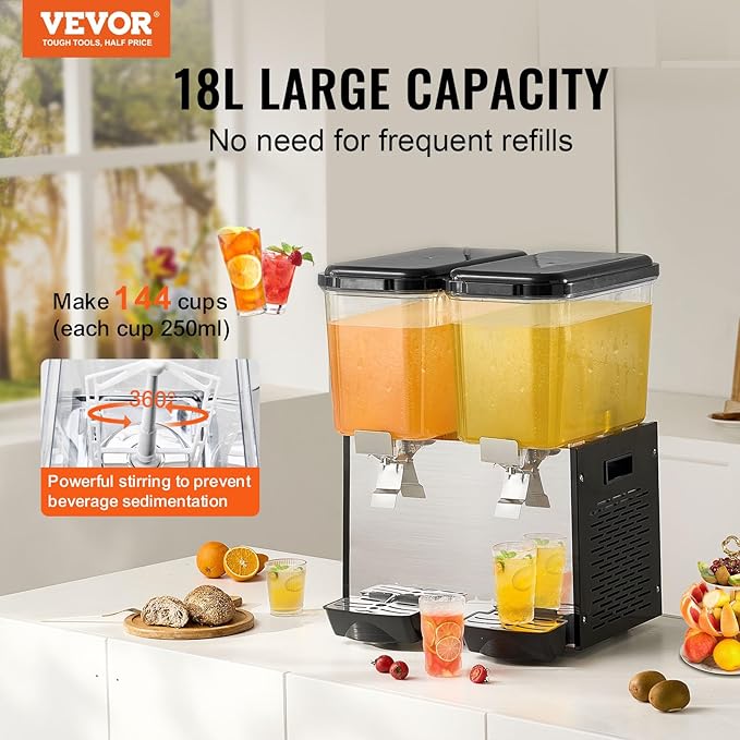 VEVOR Commercial Beverage Dispenser, 2 Tanks 18 L / 19 QT Per Tank Juice Dispenser, 370W Stainless Steel Ice Tea Drink Machine with 45°F-54°F Cooling Temperature, for Cold Drink Restaurant Bar Party
