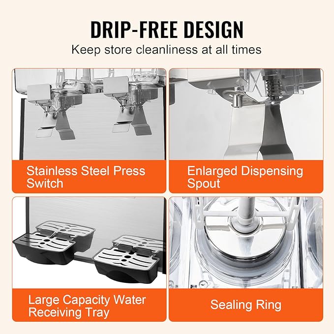 - User-Friendly Design: Features a stainless steel press switch for convenient juice dispensing and an enlarged dispensing spout for uninterrupted drinking. It can be operated with one hand. The bottom has a large capacity water receiving tray to prevent beverage dripping, eliminating the need for frequent water pouring. Enhanced radiator and anti-slip base ensure safety.
