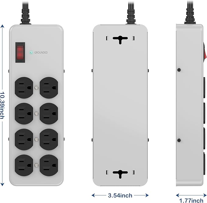 - Durable and Safe: The Metal Surge Protector Power Strip in Grey boasts a robust, extruded aluminum housing, ensuring it can withstand harsh environments. With 8 outlets and advanced surge protection, this heavy duty power strip surge protector keeps your devices safe and powered in the most demanding settings, making it an ideal workshop or garage power strip.