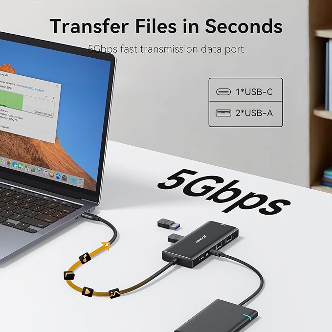 - Multiple USB C USB A Data Ports: usb c hub multiport adapter comes with 3 USB 3.0 ports (1 USB C:not for video output and 2 USB A) up to 5Gbp/s,transfer speed for quick data transfer and charging up to 5V 0.9A, 2 USB A 2.0 ports up to 480mbp/s,your can connect usb keyboard, mouse, usb driver, usb hard disks to your laptop easily via this macbook usb adapter. This macbook hdmi adapter only allows you to connect 1 HDD/SSD and this adapter won't support Apple USB super drive