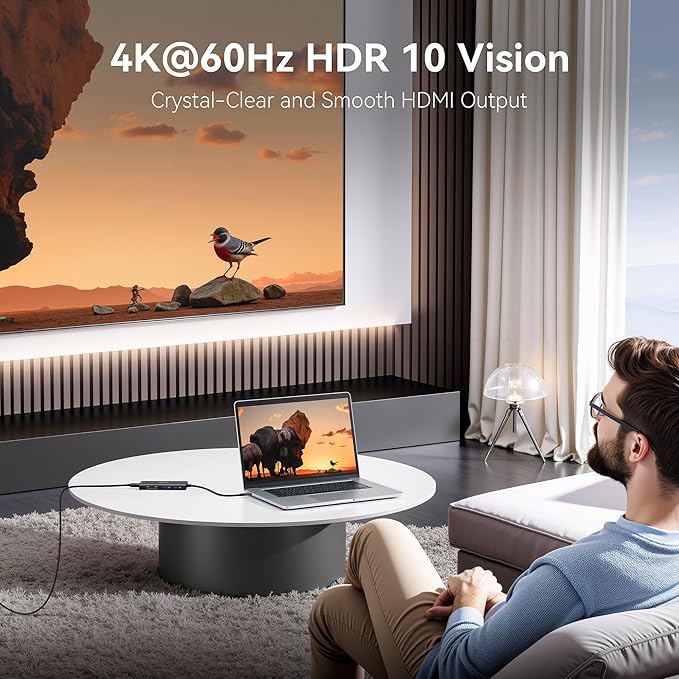 - 4K@60Hz HDMI to USB C hub: This usbc hub allows you to achieve up to 4K@60Hz (3840 x 2160) cystal-clear image,down compatible with 2K@120Hz, 1080P.This macbook air accessories adapter allows to mirror or extend your laptop screens or monitors by connecting monitors tvs projectors with hdmi ports.Please note that your usb c device’s usb c port must supportsvideo output (display port alt mode or thunderbolt),otherwise it will won’t output images on monitors or screens