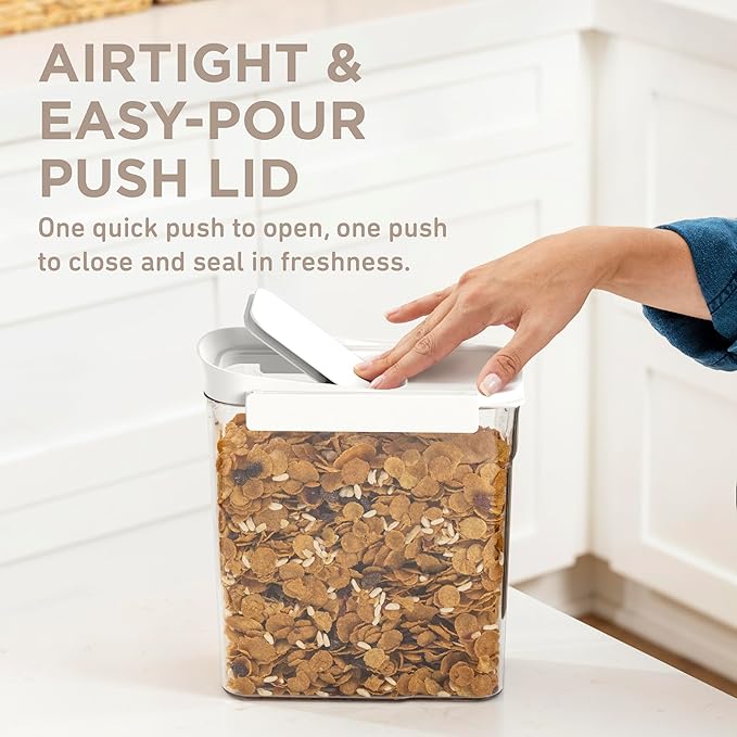 - Airtight, Easy-Pour Lids with Easy-Grip Base: Each container has an airtight lid with secure clips to keep food fresh. The cereal lid features a push-and-pour spout for mess-free pouring, while the easy-grip base allows for convenient one-handed use – perfect for busy mornings!