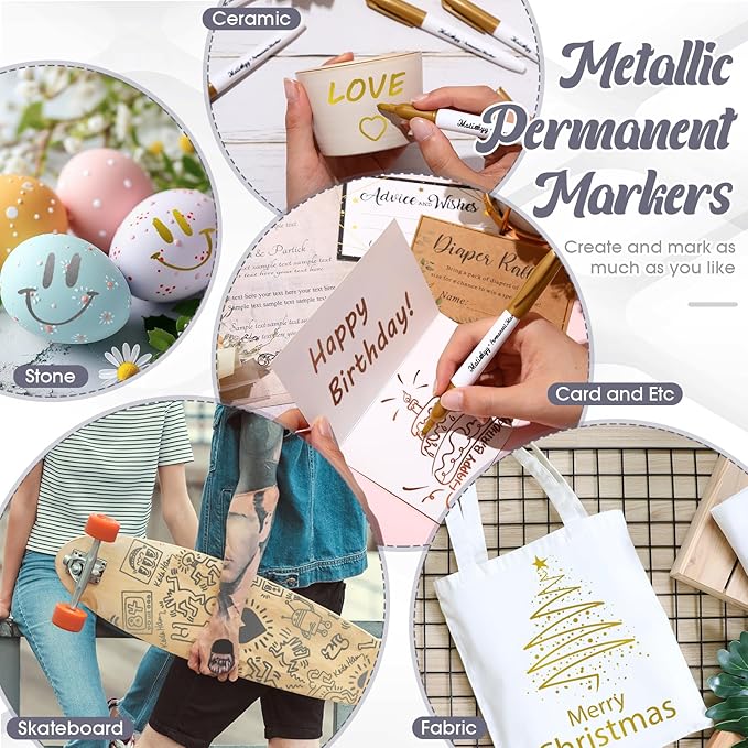 - Widely Application: These gold permanent markers can add a metallic touch to your projects, perfect for making thank you cards, birthday cards, craft decorations, DIY photo albums or scrapbooks, signing, drawing, making personalized coffee mugs, DIY gift bags, labeling storage and shipping boxes, etc