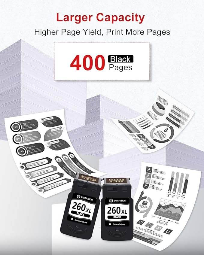 - Longer-lasting Prints: EaseFusion for canon ts6420 ink offers an impressive high page yield of at least 400 pages per pg-260xl black ink cartridge (based on 5% coverage of A4 paper). Get more printing without the need for frequent cartridge replacements