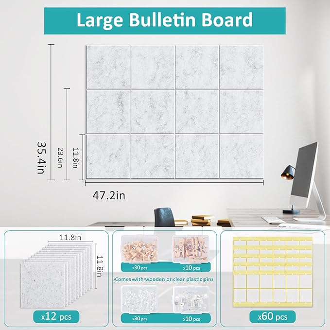 Large Cork Board for Walls 48" x 36" - 12 Pack Felt Wall Tiles with Safe Removable Adhesive Tabs - Bulletin Board for Office Classroom Home Decor - Marble White