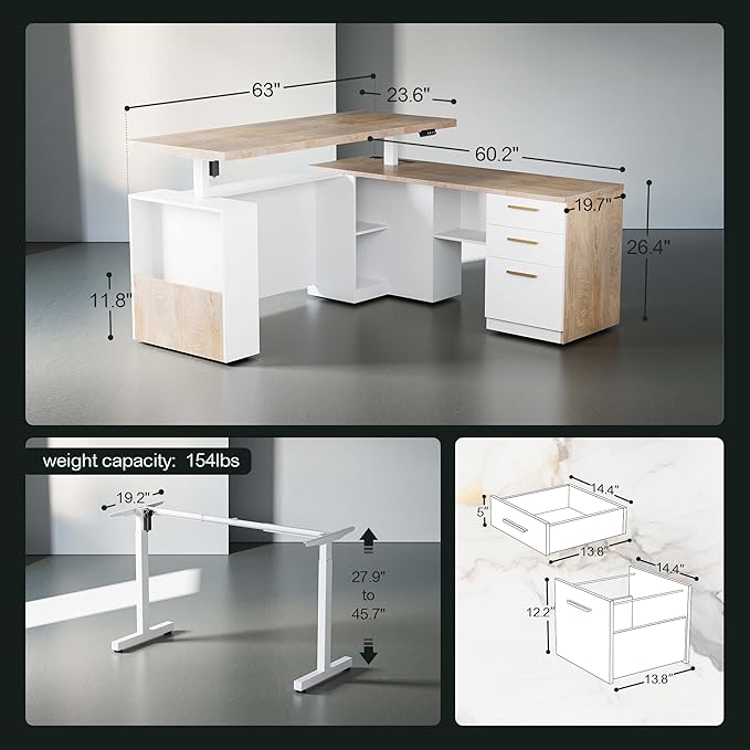63" Standing Desk with File Cabinet, Privacy Panel, AC/USB, 1.18" Desktop, Executive L Shaped Height Adjustable Electric Stand Up Desk, Home Office Table with 3 Drawers, Light Walnut