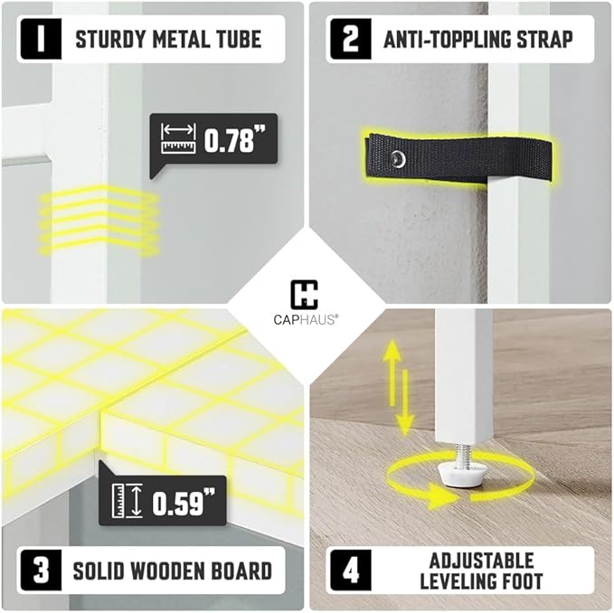 - Support and Stability: Features anti-tip hardware for added safety; metal frame is constructed with 20 mm steel; wooden boards are 15 mm thick; adjustable feet ensure level placement and stability on uneven surfaces, keeping the shelf securely in place
