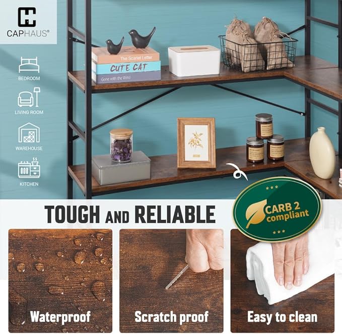 - Easy Maintenance and Durability: This rustic oak L-Shaped bookshelf is easy to clean, waterproof, and scratch-proof; designed for long-lasting use; CARB P2 approved for safety and low emissions, ensuring a healthier indoor air quality in your space