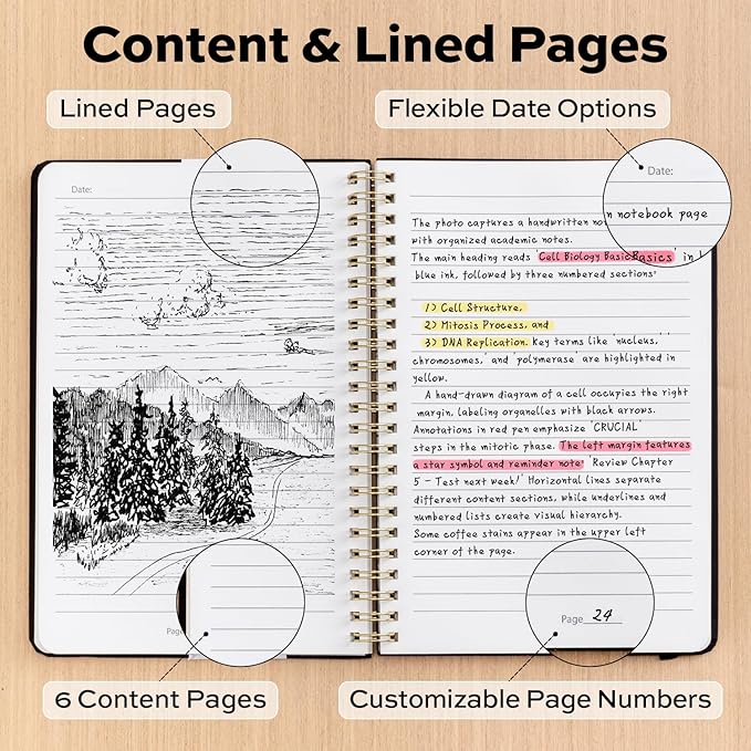 - Expandable Inner Pocket & Elastic Band: Lined Spiral Journal Notebook is equipped with an expandable inner pocket on the back cover for storing sticky notes and note cards, making it easy to organize study materials and record inspiration anytime. Featuring an elastic closure band, it closes easily and quickly to prevent damage to the inner pages, offering a more convenient user experience and long-lasting protection.