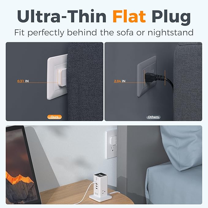 - Flat Extension Cord: With only 0.31 in ultra thin flat head design, USB C charging station can easily fit in tight spots and hide behind sofa, bed, nightstand or other furniture, sitting flush against the wall; 45 angle right angle design create an extra space for other plug below without blocking