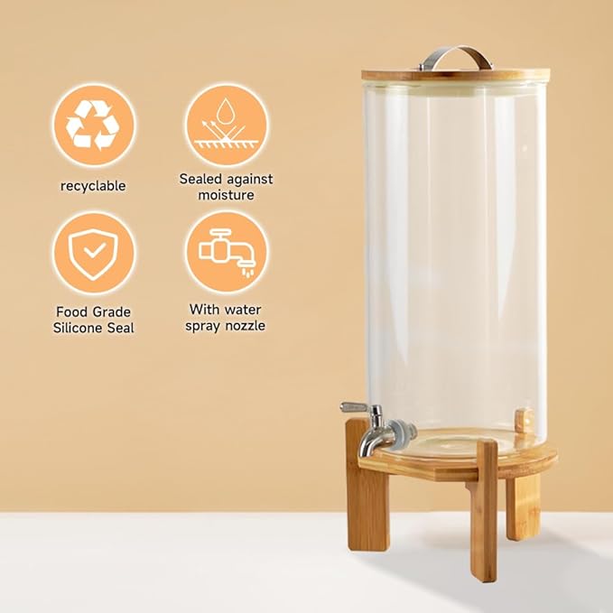 - Premium Glass Material: The drink dispenser with stand is made of high-quality, food-grade, durable, thick, lead-free glass. It can hold both hot and cold drinks, is BPA-free, non-discoloring, and easy to clean.