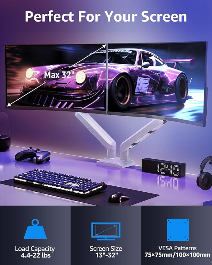 - Universal Compatibility:The dual monitor stand perfectly fits most flat or curved LCD computer screens 13"- 32".Each arm supports a weight of 4.4-22lbs, compatible with VESA patterns 75x75mm and 100x100mm.Support C-clamp (desk thickness within 0.39''-2.76'') and grommet mount (desk thickness within 0.39“-2.76”&hole diameter within 0.39''-2.36'') mounting installation.