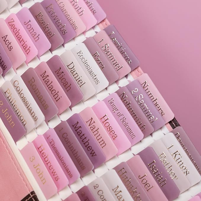 - Large Print, Easy to Read & Easy to Install: Silky velvet touch laminate,carefully designed pretty Bible accessories . The peel-and-stick Bible index tabs are self adhesive, simply align them with the provided guide or place them creatively.