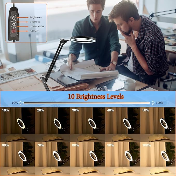 - 【Customizable Lighting with 3 Color Modes】The magnifying lamp includes three color options: cold white light, warm light, and a mix of white and warm light. With 10 adjustable brightness levels (10% to 100%), you can select the ideal light for any environment or task, whether you’re working on puzzles, painting, embroidery, or manicures.
