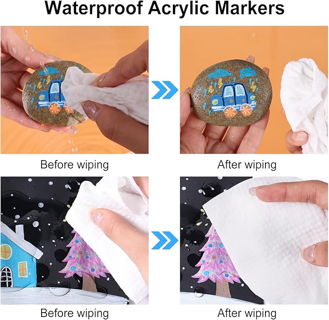 - Upgraded Waterproof and Easy to Use: Our new acrylic paint set do not require shaking or pressing the pen tip to release inkโjust open the lid and start using them directly! Coloring Markers set are made with water-based ink, which providing a smooth, consistent application with even ink flow for a more effortless painting experience. The resulting artworks are brightly colored, waterproof, fade-resistant, and sun-resistant, making them ideal for long-term preservation.