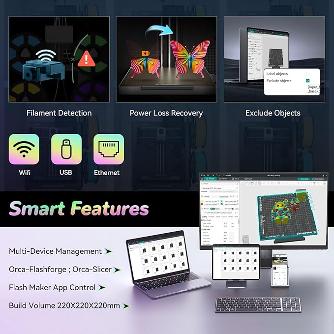 - Multi-Device Management: With Flash Maker and Orca-Flashforge,it allows users manage hundreds of printers remotely,real-time monitoring of print progress(need to add an additional camera kit),adjust parameters, receiving message alerts,and enjoy freedom in managing filament colors and types. with FilaBees 3D Printing filament, AD5X allows you to unlock 7x24h stable multicolor printing experience