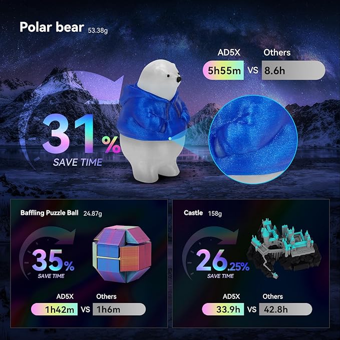- Speedy and Stable: FLASHFORGE AD5X 3D printer can reach up to 600mm/s travel speed and 20m/s² acceleration, CoreXY all metal design ensures stable printing quality at high speed