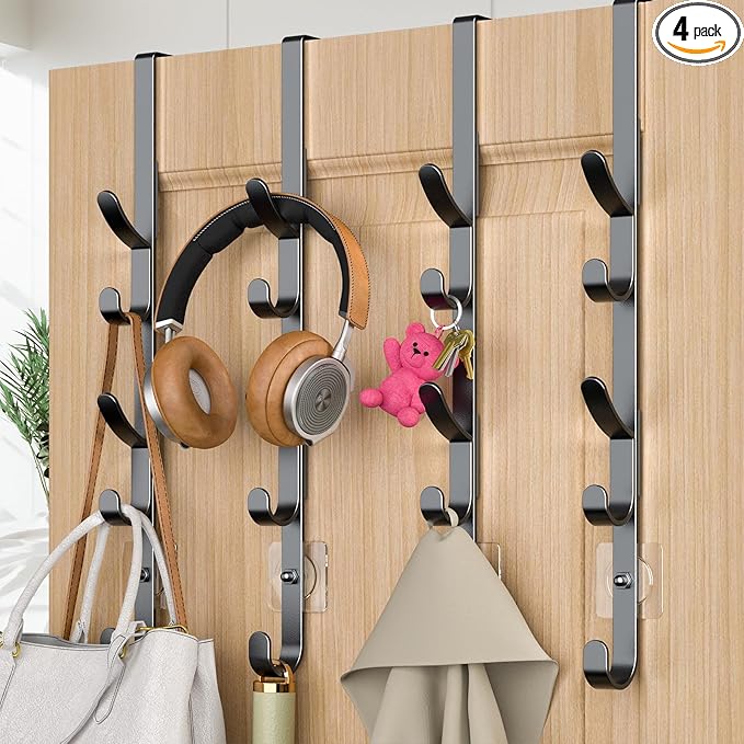 Over The Door Hooks, Metal Door Hooks for Hanging, Over The Door Purse Organizer for Coat Hanger, Back of Shower Door for Hanging Towel Rack Clothes, Hat, Bathroom, Closet (Black-4Packs)