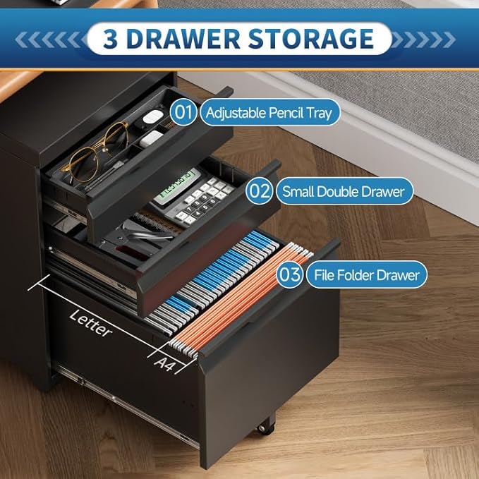 - 【STYLISH & PRACTICAL】3 Drawers storage with removable pencil trays and adjustable hanging bars which can hold letter, legal, and A4 size hanging files. The sleek and modern finish is an easy fit for office or home study.