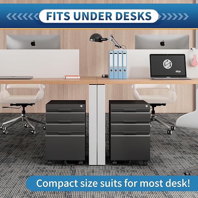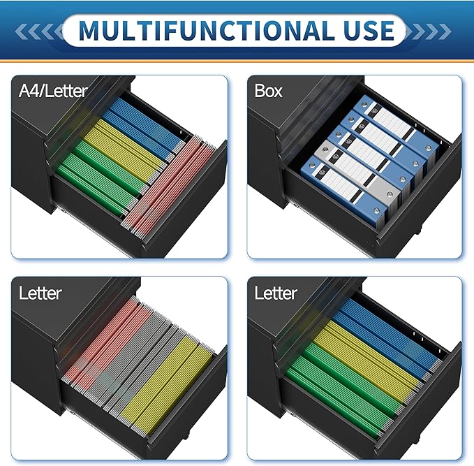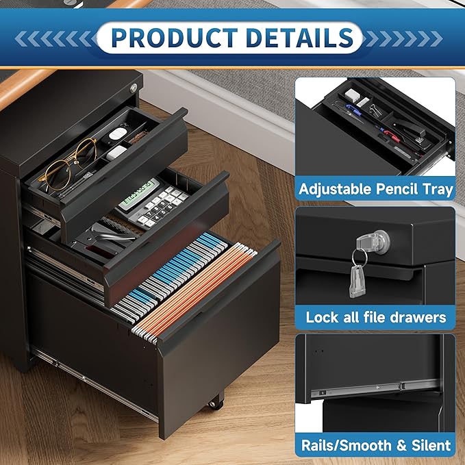 - 【LOCKABLE & 360°SWIVEL WHEELS】Five 360°swivel wheels allow you to move this 3 drawer file cabinet around with ease. while lockable casters offer braking and the center support wheel prevents tipping.