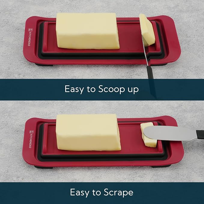 - Easy to Scoop up & Easy to Scrape:Have side stoppers to wipe off the excess butter and rest the knife. The stoppers at both ends of the clear butter holder help you easily scoop up butter. Slide the knife up the stopper and use the top of the stopper as a scraper to remove the remaining butter and clean your knife