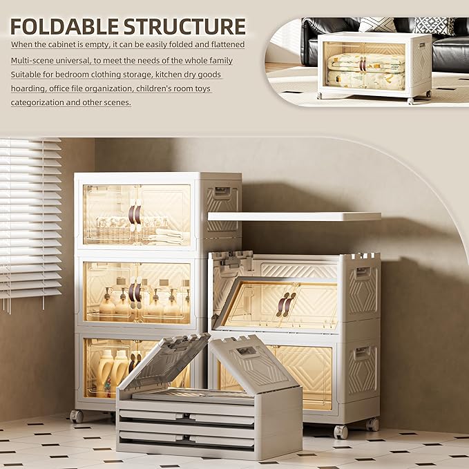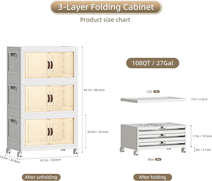 108 QT / 27 Gal Stackable Storage Bins (1 Lid) w/Wheels & Magnetic Doors, Collapsible Plastic Organizer Cabinet for Closet Office Garage - White Storage Containers