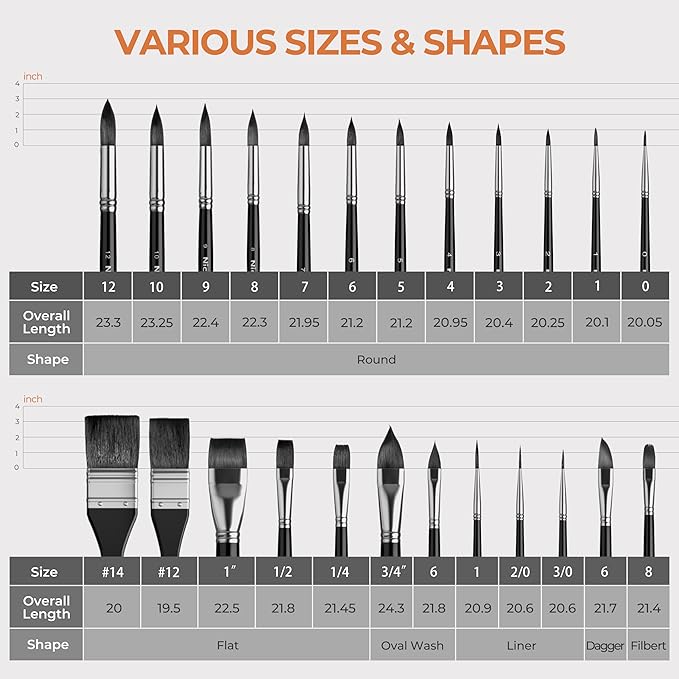 - 24 Watercolor Brushes in 6 Versatile Shapes: The paint brush set includes 24 brushes in 6 different shapes— Round (#0, #1, #2, #3, #4, #5, #6, #7, #8, #9 #10, #12), Liner (#3/0,#2/0, #1), Flat (#12, #14, 1/4", 1/2", 1"), Filbert (#8), Dagger (#6) and oval Wash (Cat's Tongue) #6, 3/4". Perfectly curated to meet all watercolor techniques—from fine detail to broad washes.