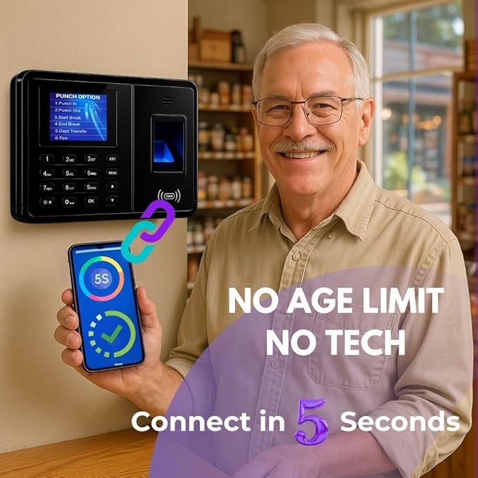 - 5-Second Setup, No IT Needed - Plug in and start instantly. Set up employees, attendance rules, and export reports—all from your phone with our simple app. No tech skills required.
