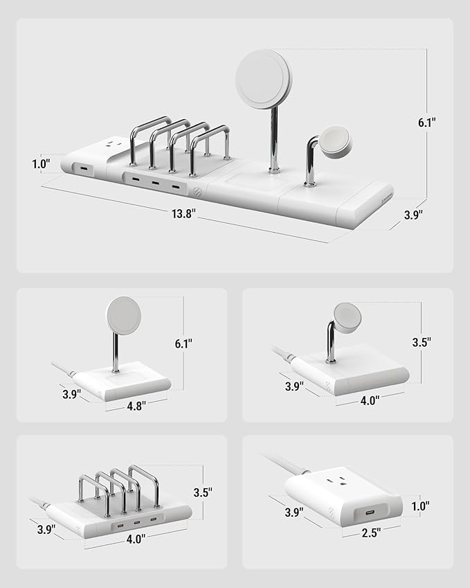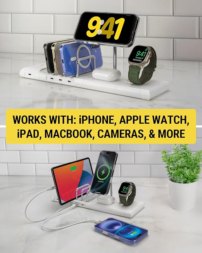 - Wireless Charging: Power up with a 15W charging stand for iPhone 12 and newer, an Apple Watch charger, and a 5W pad for AirPods. This station offers secure wireless charging with built-in overheating protection and power-sharing features