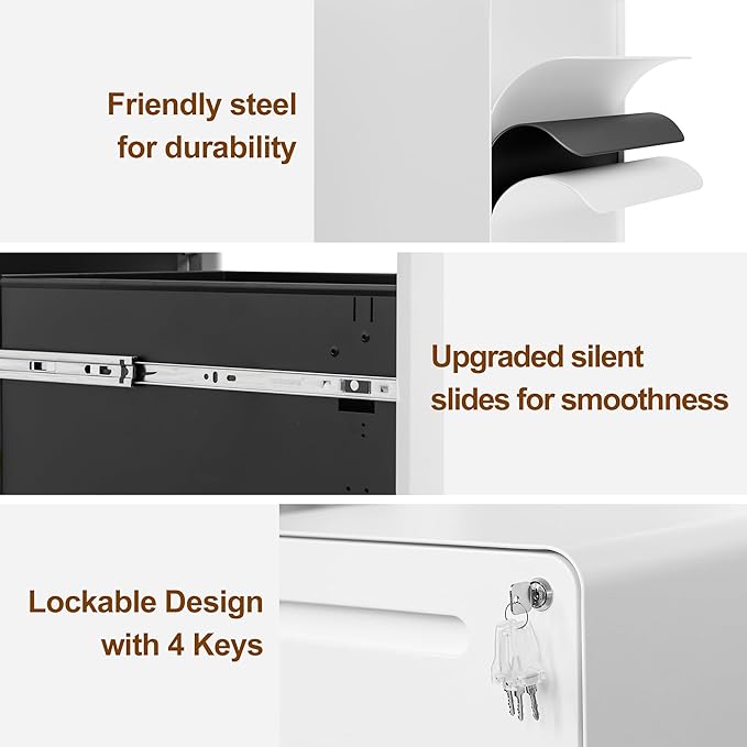 - [5 360°Swivel Casters,Synchronous Lock Security System]:LVSTEEL filing cabinet is equipped with 2 locking casters, 2 360° swivel casters and 1 anti-tilt wheel to ensure flexible movement and stability and safety. At the same time, the synchronous lock security system on the top can lock two drawers at one time and comes with four keys, effectively protecting the safety of internal documents and personal belongings.