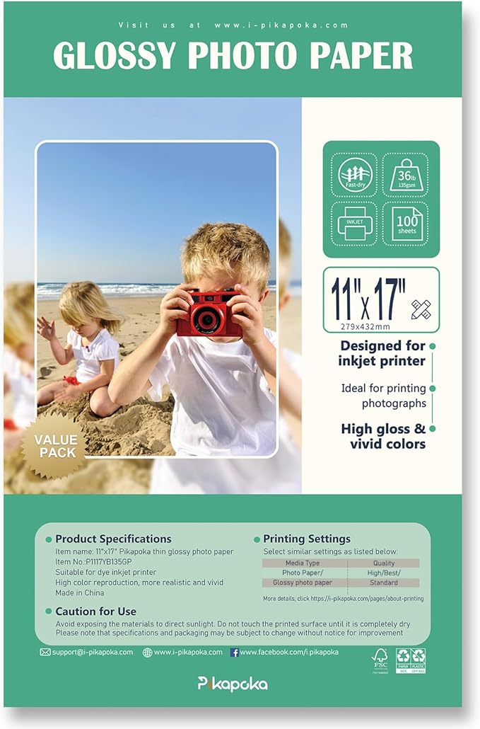 - Pikapoka thin glossy photo paper 36lb(135gsm), size: 11x17 in, 100 Pack