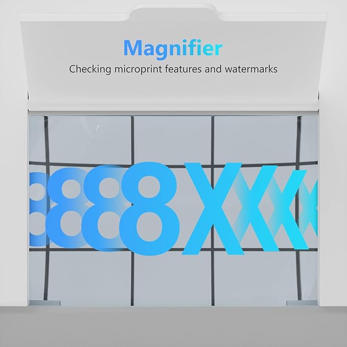- 【8X Magnifying Glass for Precision】 Enhance your verification process by using the built-in magnifier to spot microprints, fine details and security markings, ideal for professionals who need a reliable counterfeit detector