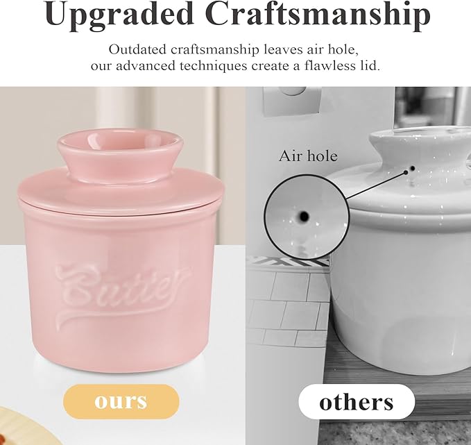 - DURABLE CERAMIC BUTTER KEEPER WITH LID - High quality ceramic with lid to protect butter from air. Add a touch of elegance to any kitchen with this butter holder with lid and spreader.