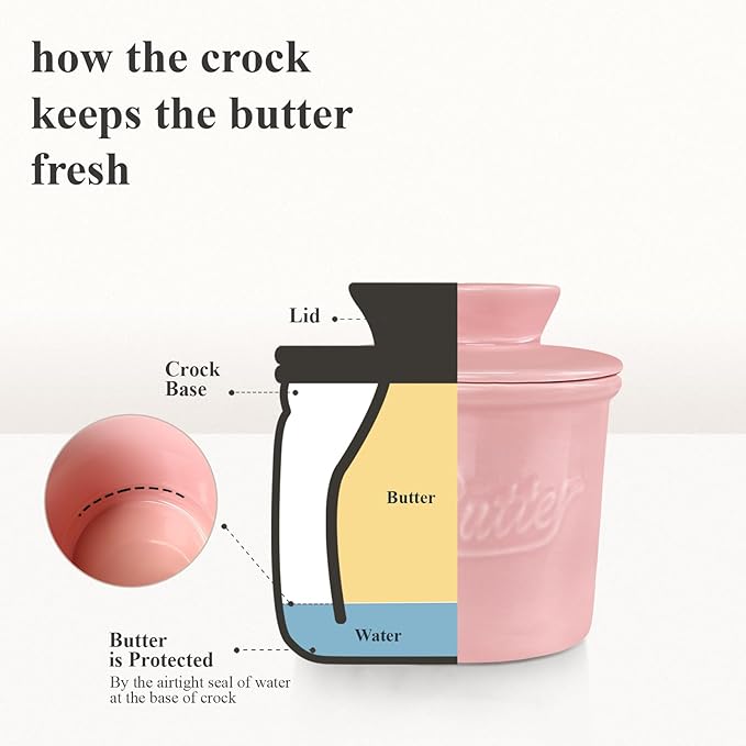 - KEEPS BUTTER FRESH - This butter crock uses water-seal technology to keep your butter fresh and spreadable for up to a month without refrigeration. Plesase Note: To keep the butter fresh, replace the water in the butter crock every 2-3 days.