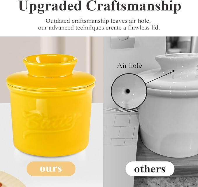 - DURABLE CERAMIC BUTTER KEEPER WITH LID - High quality ceramic with lid to protect butter from air. Add a touch of elegance to any kitchen with this butter holder with lid and spreader.