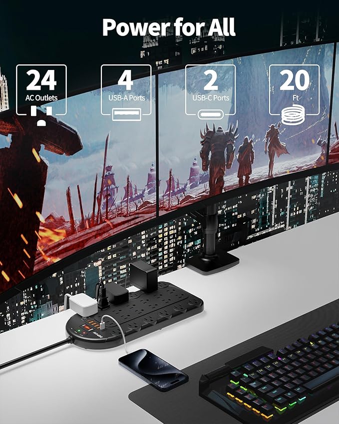 - 【Power for All】-Features 24 grounded outlets, 4 USB-A ports, and 2 USB-C ports to allow you to power up your gaming or media setup, computer, laptop, phone, and camera at the same time. One charging station for a clutter-free desk.