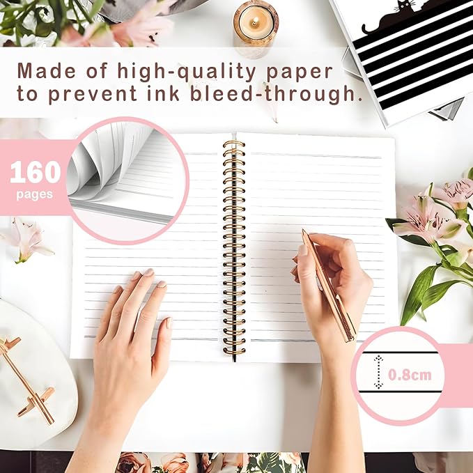 - 【Durable Material】 This spiral notebook is made of durable and sturdy materials, featuring gold double-wire binding to ensure the coil stays secure and doesn’t loosen easily, providing a smooth page-turning experience. The notebook can fold completely 360°, making it easy to write in any situation. It contains high-quality paper that prevents ink bleed-through, offering a smooth writing and drawing experience. The firm cover is resistant to bending, protecting the internal pages.