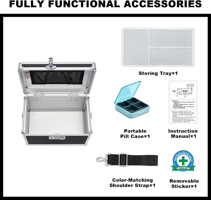 - 【REMOVABLE ACCESSORIES FOR USER-FRIENDLY APPLICATION】 With a removable First Aid sticker, top tray, and adjustable shoulder strap, users can customize the storage box to suit their needs. It can be used to securely store cash, jewelry, cosmetics, ID documents, and other valuables, making it versatile for various venues. It also makes a perfect gift for family, friends, or employees, expressing your care and thoughtfulness. We hope you enjoy organizing and securely locking away your most cherished items.