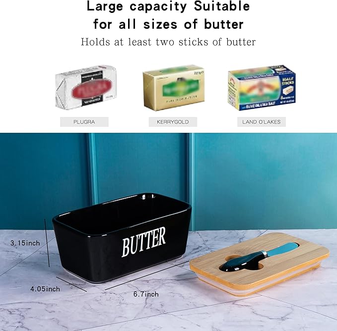 - 【 Safe Quality 】 Our black ceramic butter dish is made of professional-grade non-stick porcelain that is safe and harmless. Easy to clean and tidy, you can safely put them in the oven, microwave, dishwasher and refrigerator. Unlike synthetic materials, our bamboo cover material is very hard and thick. It is not prone to aging or damage. The blade on the butter cap groove is made of stainless steel to protect the health of you and your family