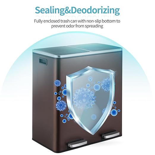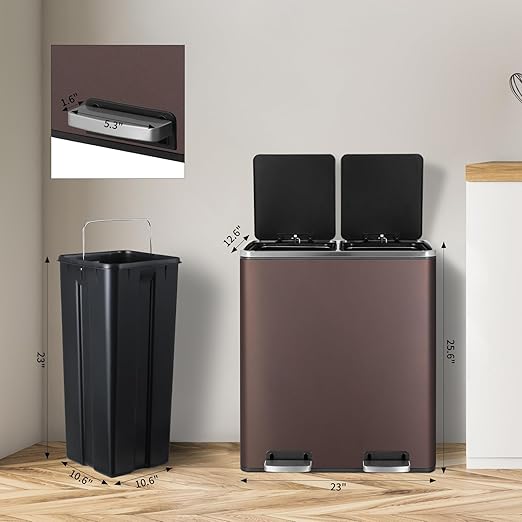 - 2×8-Gallon Compartments: 16-gallon step trash can has two compartments, combining garbage and recycling. Completely separated dual garbage and recycling can also avoid the smell of garbage. 2 removable inner buckets increase convenience