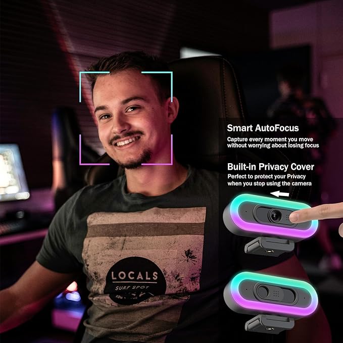 - 【Webcam with Light】: This Gaming webcam has Fill RGB light, adds colorful atmosphere, elevate your gaming /Youtube/Twitch streaming, when switching to white light with 3 Levels of brightness, it will become a ring white light for a professional,well-lit look during business meeting,online learning or video calls