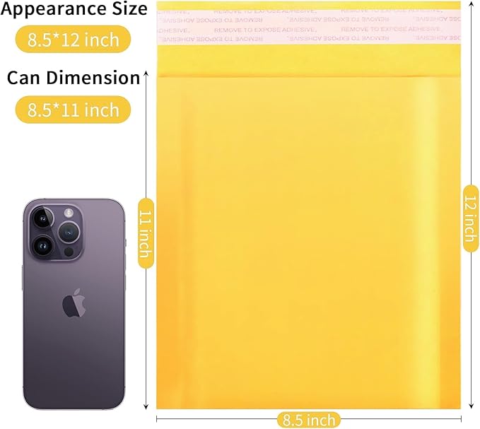 - 8.5×12 Bubble Mailers size:Our Kraft bubble mailers appearance Size 8.5x 12" inch,usable dimension 8.5x 11" inch,With 25 yellow self seal adhesives padded envelopes.The light weight can reduce transportation costs and can be used to package and transport trading card,office supplies,jewelry,cosmetic and more,great for small business packing.